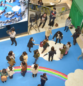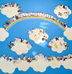 テーマは「100人虹のかけはし」空に見立てた大きな青い布に、白いじゅうたんで雲を、スポンジで虹を表現。