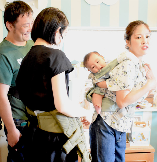 実践を交えながら、おんぶの仕方やお手入れ方法まで、丁寧に教えていただきました。